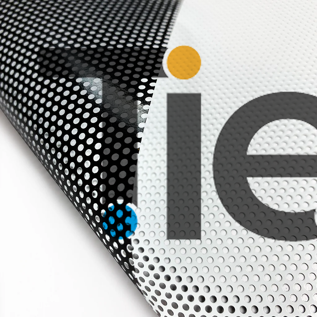 Vinilo microperforado de visión unidireccional, aplicado externamente a la superficie de una ventana para crear una presentación gráfica visual desde el lado de los espectadores. Desde el interior, la ventana parece clara, lo que le permite ver hacia afuera y aún así recibir luz natural en el edificio. ¡Uno de nuestros tipos más populares de gráficos para ventanas!